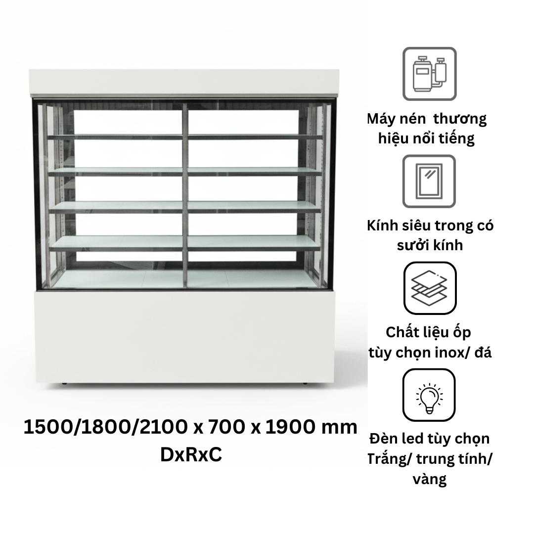 Điểm nổi bật của dòng tủ này là công nghệ máy nén Inverter, giúp tiết kiệm điện năng đáng kể, vận hành êm ái và duy trì nhiệt độ ổn định trong suốt quá trình sử dụng. Nhờ đó, bánh luôn được bảo quản trong điều kiện tối ưu, giữ nguyên độ tươi ngon và hình thức hấp dẫn.